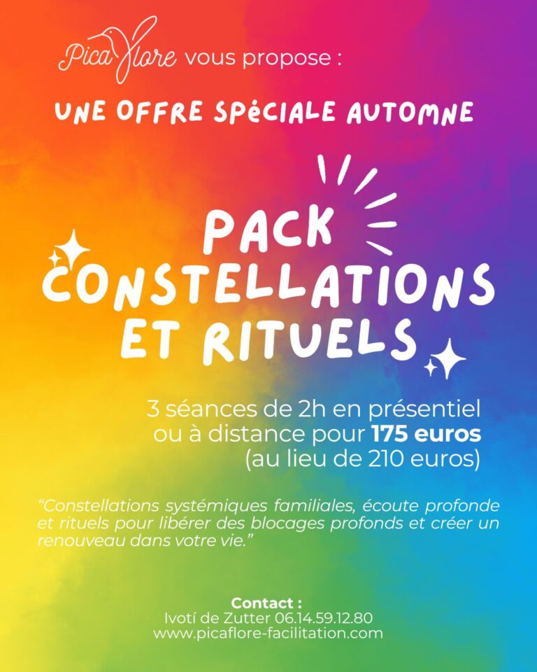 Je propose également un suivi sur 3 séances qui inclut des temps d’écoute profonde et des pratiques autour des constellations systémiques et de la ritualisation, pour travailler sur votre intention posée au départ et l’ancrer dans la matière. Le pack de 3 séances de 2h est au prix de 210 euros.